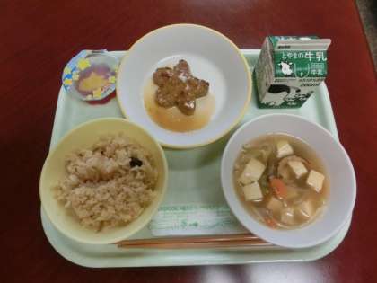 今日は、七夕にちなんだ給食です。献立は「五目ごはん、牛乳、星形ハンバーグ、豆腐スープ、七夕ゼリー」です。子供たちはおいしい給食をいただいています。