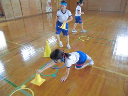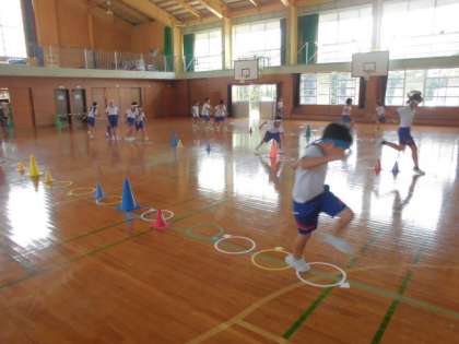 コーンを使って、ハードル走につながる運動をしました。チームで話し合って、どうやったらリズムよく、スムーズに跳べるのか、コーンの置く位置を相談しながら取り組んでいました。