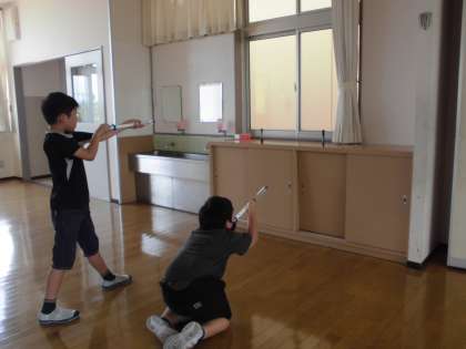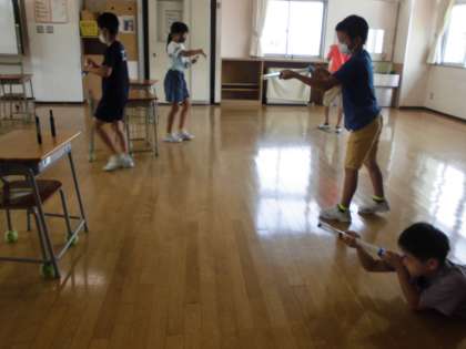 「空気と水」の学習の様子です。今日は最初の学習で、空気鉄砲を使い、的当てゲームをしました。遊びながら、「あれ、どうしてだろう」「不思議だな」ということを見つけていた子供たちです。