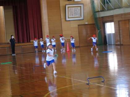 体育では、ハードルを飛び越しながらバトンをつなぐ「ハードルリレー」の学習をしています。