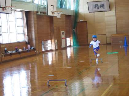子供たちは速くハードルを飛び越すために、「『ぴょんぴょん』高く飛ばないようにすればいい」「ハードルよりも遠いところを目指して飛べばいい」など、友達の飛び方を見ながら考えていました。