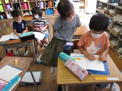 子供たちは、お話をよく読み、足し算と引き算が混ざった式だということに気付きました。そのあと、どのようにして答えを出すか、ブロックを使ったり、さくらんぼ計算をしたりして、グループで考えていました。