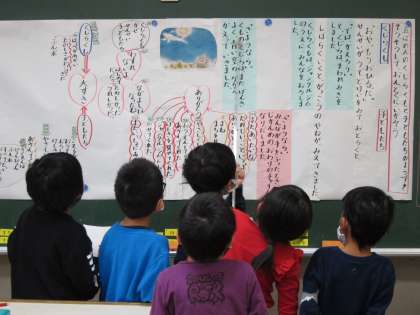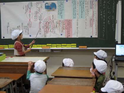 2年生に向けて音読発表会を計画している「くじらぐも」。今回は、5場面の様子を想像して、音読に生かす学習をしました。