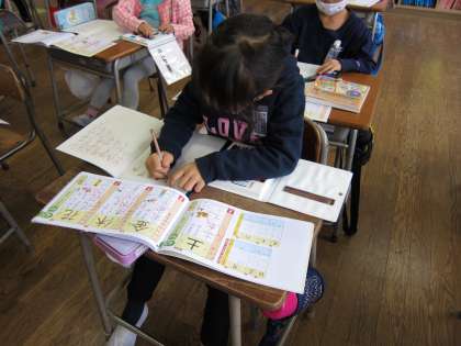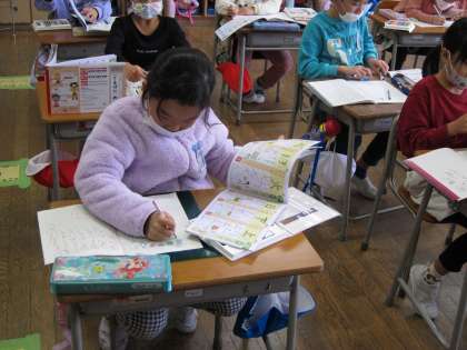 子供たちは、漢字ドリルに載っている漢字の成り立ちを参考にしながらクイズを作りました。クイズ大会では、友達が出す問題に一生懸命考えて答えていました。