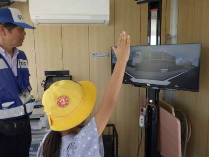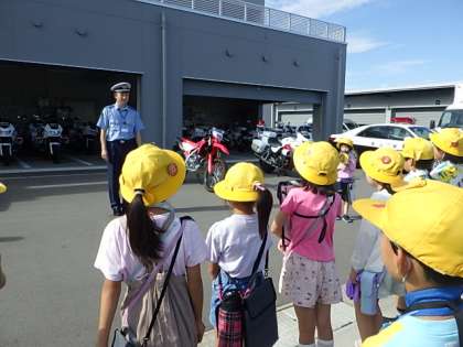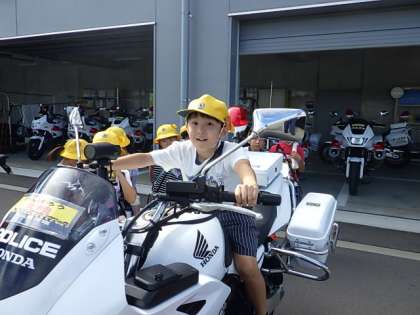 町探検の第3弾として、校区にある富山県警交通機動隊を見学しました。パトカーや白バイの説明を聞いたり、実際に乗せてもらったりして、安全を守るために付いている装置に驚いていました。また、横断歩道を渡る時のシュミレーションゲームを体験し、交通安全について改めて考えていました。
