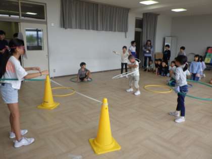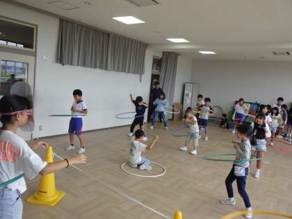 昼休みに運動委員会が「運動しんけいばつぐんくんとフラフープ対決」を開きました。40人の子供たちが参加しました。友達同士で応援し合って楽しく運動する針っ子たちでした。