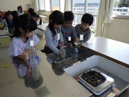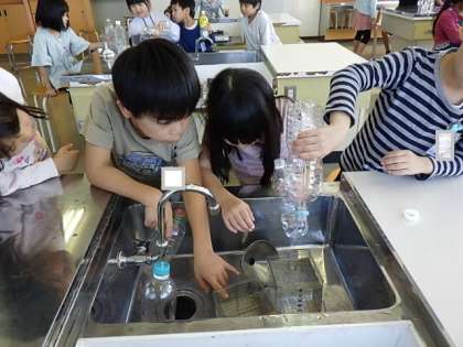 算数科「どちらがおおい」では、水のかさを直接比べたり、他の入れ物に移しかえて比べたりする学習をしました。子供たちは水をこぼすと量が変わると考え、気を付けて入れていました。