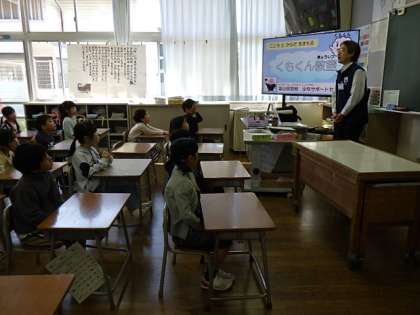 くもくん教室がありました。くもくん(主人公)から、たくさんのことを教えてもらいました。プライベートゾーンは、自分も他の人も大切な場所であることが分かりました。子供たちは、クイズを真剣に考えたり、答えたりできました。