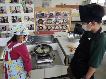 自立活動で「なかよしクッキング〜おいしいポップコーンをつくって、みんなハッピー!!〜」という学習を進めています。まずは、二人でキャラメルポップコーンをつくってみました。1年生にとっては初めてのポップコーンづくり。協力しておいしいポップコーンをつくることができました。しかし、「おいしいけど、ちょっと塩っぱいな」「堅い実が残っているな」と、改善点を見付け、さらにおいしいポップコーンをつくりたいという気持ちを高めていました。