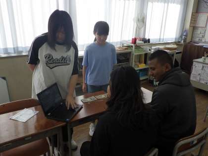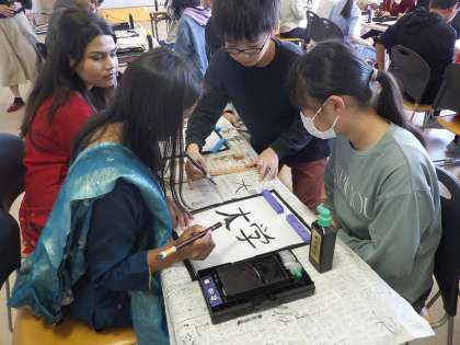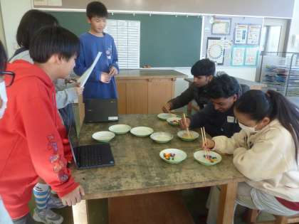 富山国際学院の方との交流会(6年生) 公開日 2024/11/08 更新日 2024/11/08 学校の様子 12名の学生さんたちが針原小学校に来てくださいました。 今日まで準備してきた、日本文化の紹介や日本のお金の紹介、五目並べや豆つかみゲームなどを楽しんでもらいました。また書道体験を行いました。 ジェスチャーや表情で思いを伝えようと一生懸命な6年生でした。
