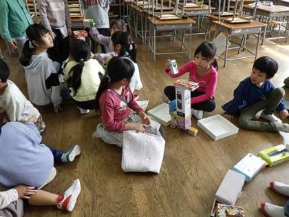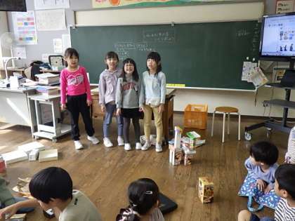 1年生では、算数科で「かたちあそび」をしました。いろいろなものを箱で作って、紹介し合いました。どの作品も平ら面や同じ高さになる面を上手に使って動物やロボット等を作ることができました。
