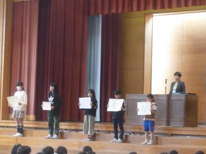 集会後には、夏休みの作品やあいさつ標語等で、受賞した人の紹介を行いました。