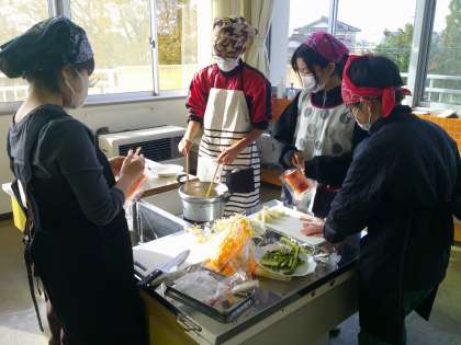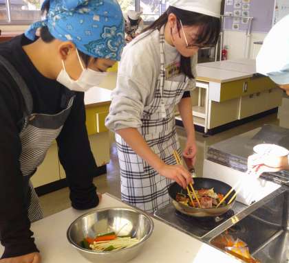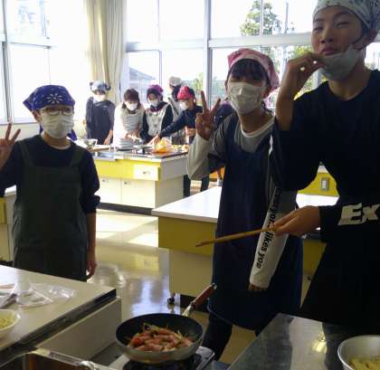 家庭科で「ベーコン巻き」の調理実習を行いました。巻くのは、アスパラ、にんじん、えのきだけの他、ズッキーニ、もち、さつまいも等、グループでオリジナルベーコン巻きを考えました。栄養バランス、彩りよく、おいしいベーコン巻きができあがりました。