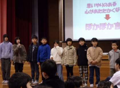 12月4日〜10日の「人権週間」にあわせて、全校で「心ぽかぽか集会」を行いました。誰でも一人一人が楽しく幸せに生きる権利をもっていることをしっかりと確認し、各学年の代表が、遊びに誘ってもらったり優しくしてもらったりしてうれしかった経験やありがとうの気持ちを発表しました。また、なかよし班ごとにぽかぽか言葉を見付けました。これからも針っ子みんなでぽかぽか言葉がいっぱいの温かい学校をつくっていきましょう!