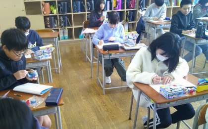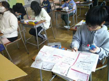 理科では、電気のはたらきについて学習しています。手回し発電機を使って、発電しながら、豆電球と発光ダイオードを違いをまとめていました。