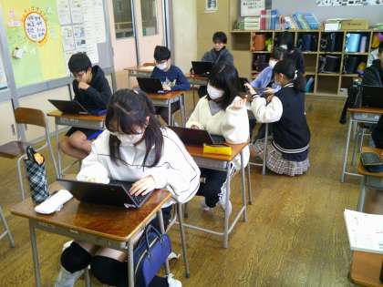 国語科では、「推し推しパンフレットをつくろう」という課題で、パンフレットを作っています。自分の好きなことを先生方にパンフレットで伝え、興味をもってもらうことを目指して、取り組んでいます。相手意識を十分にもちながら、作成しています。