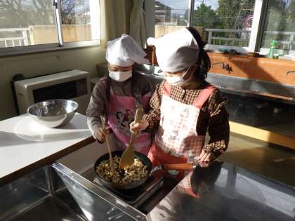 1年生チームと3・4年生チームに分かれて、ポップコーンをつくりました。なかよし級でポップコーンをつくった経験を活かして、あおぞら級の友達に教えたり、アドバイスしたりしながら、仲良くつくることができました。自分たちで育てた実を使って、自分たちでつくったポップコーンの味は最高でした。