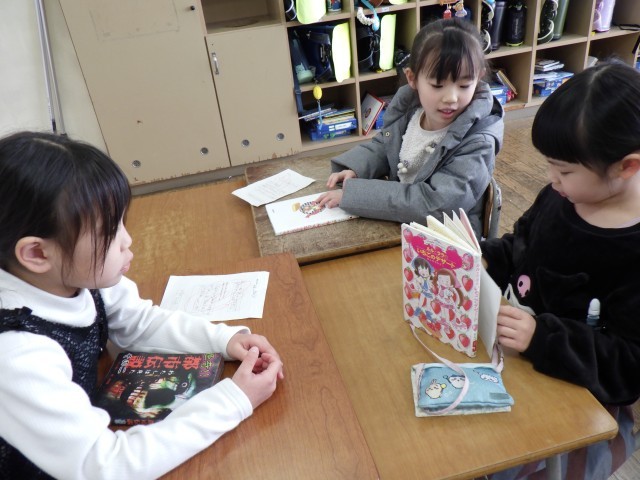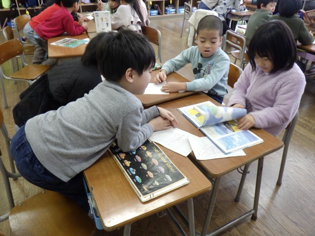 1年生では、国語科で「くわしくきこう」を学習しました。グループになり、話す人は、本を見せながら、題名と主な登場人物、おもしろいところや好きなところを紹介しました。聞く人は、もっと知りたいことを尋ねて、友達の話を詳しく知ったり、楽しく聞いたりしました。いろいろな本のおもしろさに気付きました。