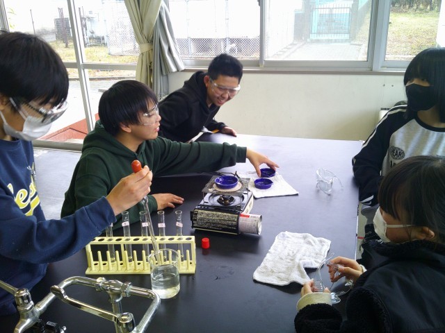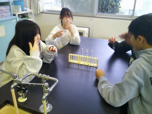 理科では、水溶液の性質について調べています。見た目やにおいだけではなく、蒸発させた時に出てくる物があるかないかという実験も考え、実践しています。