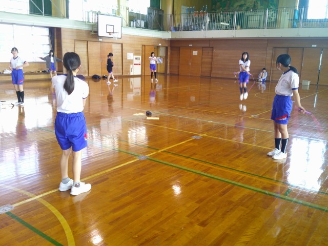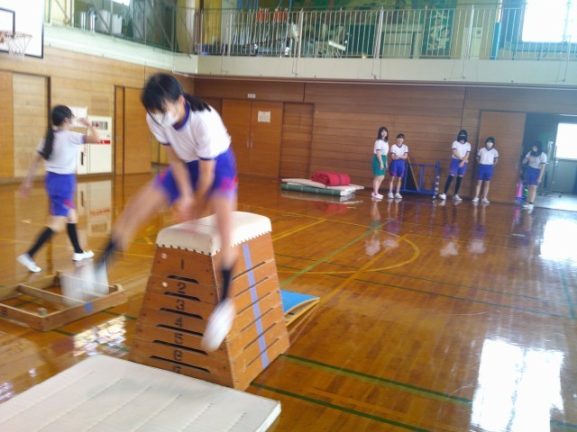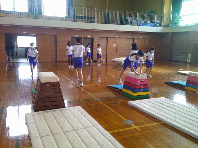 体育科では、跳び箱運動と縄跳びを同時に学んでいます。跳び箱では、開脚跳びができるように何度も挑戦していました。縄跳びでは、縄跳びカードをもとに、数を数えながら取り組んでいました。