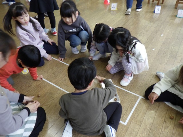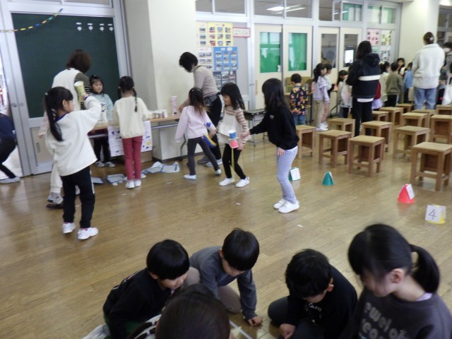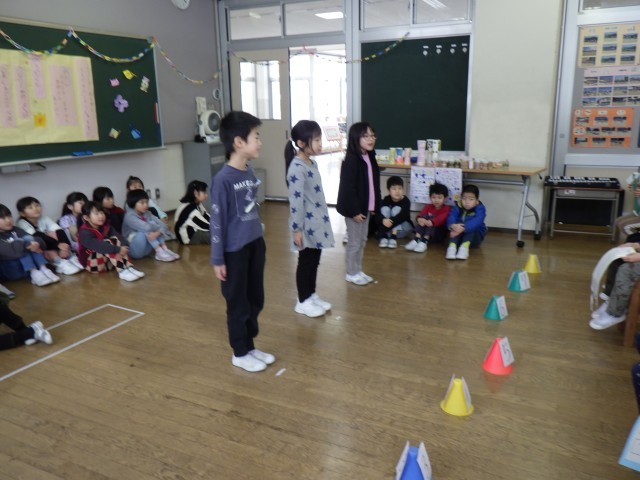 1年生は、来年度入学する年長さんと「ようこそ わくわく ともだちになろうしゅうかい」をしました。年長さんに喜んでもらおうと一生懸命に準備し、いよいよ本番です。今まで学習してきたことを生かして8つのコーナーを作りました。それぞれのコーナーで課題にクリアすると手作りプレゼントを渡していました。終わってから、年長さんに「楽しかったです」と言ってもらい、とてもうれしそうでした。片付けも、みんなで協力してあっという間にできました。