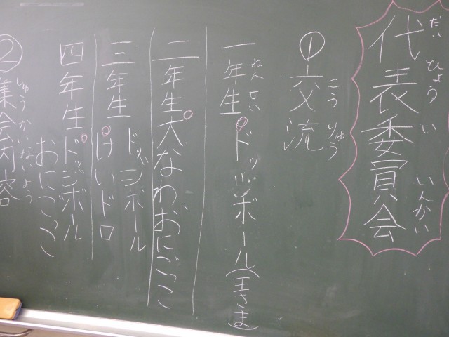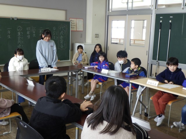 卒業を祝う週間に向けて、各学年の代表の子供が集まって話し合いました。司会の子供が話し合いを進め、出し物や交流の内容を決定しました。5年生が中心となって頑張っています。