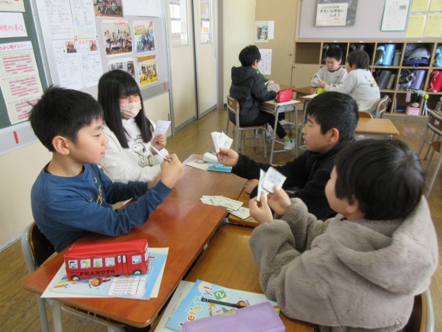 I wake up.や I have breakefast.など、生活の中でつかう英語を、カードゲームを使って学習しました。大いに盛り上がりました。