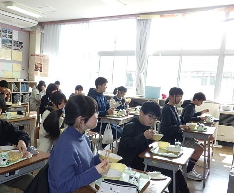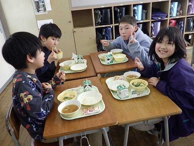今日の給食はひな祭り献立でした。鶏と卵の2色丼、白玉入りすまし汁、野菜のお浸し、ひなあられ、牛乳です。上学年では「白玉が柔らかくておいしい」という声がたくさん聞かれました。野菜たっぷりで彩りがよく、給食からも春を感じながら食べていました。