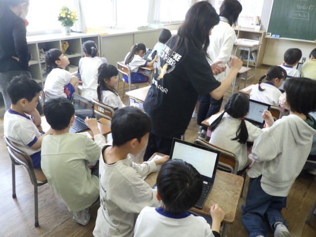 1年生教室に行って、一人1台端末の設定やアンケートに回答するための手伝いをしました。1年生の子供の目線に合わせて優しく声をかける6年生でした。