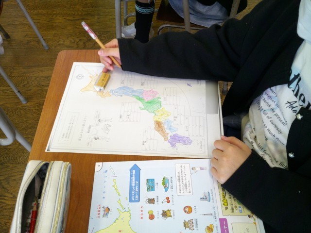 社会科では、都道府県を地域ごとに分けて確認しました。自分で色分けをしながら、興味のある都道府県を覚えていました。