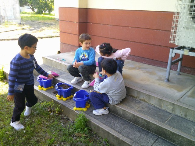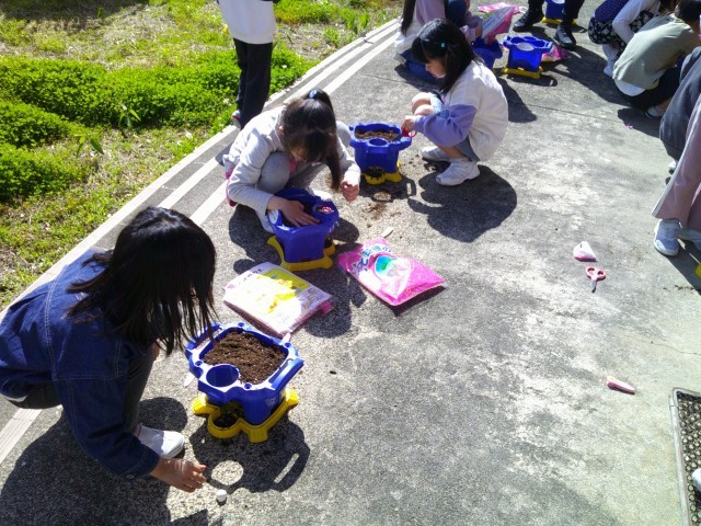 自分の鉢に土を入れて野菜を植える準備をしました。