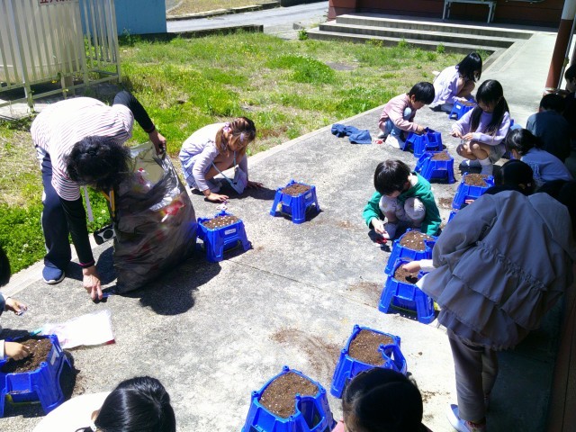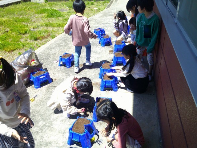 あさがおの種を植えました。土がこぼれないように気を付け、種の間隔をしっかりととって植えていました。
