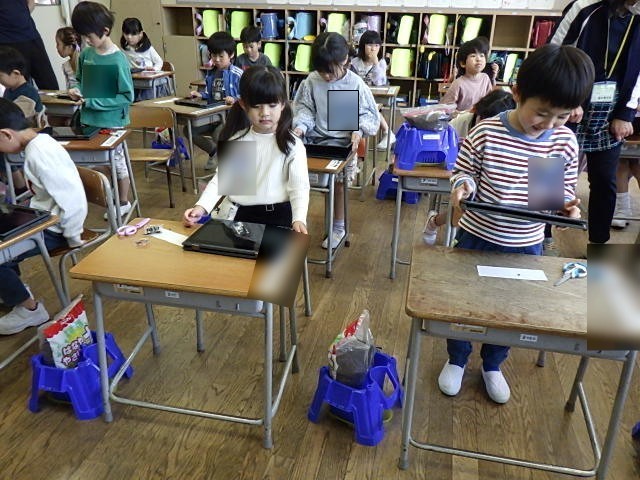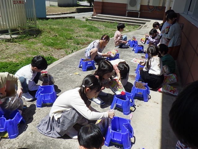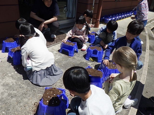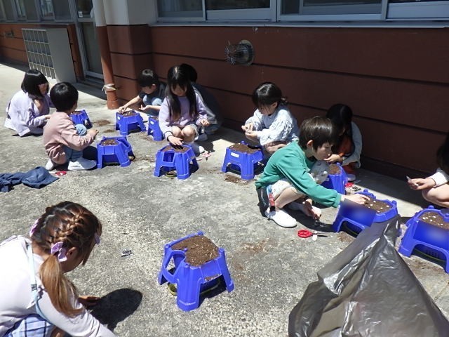 あさがおの種の写真を撮ってから、外に出てみんなで種を植えました。