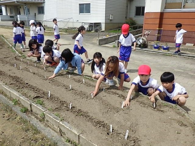 ひまわりとほうせんかとマリーゴールドの種を選び、畑に植えました。