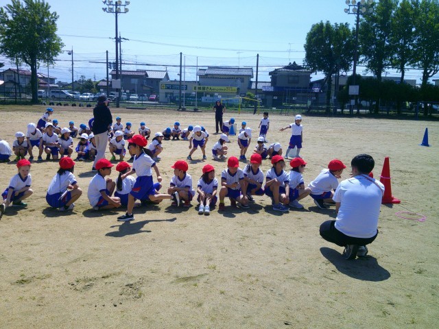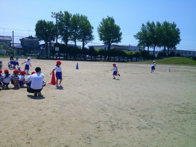 折り返しリレーを練習しています。バトンパスがスムーズになり、人と人の間を詰める必要性を感じるなど、上達を楽しみながら運動しています。
