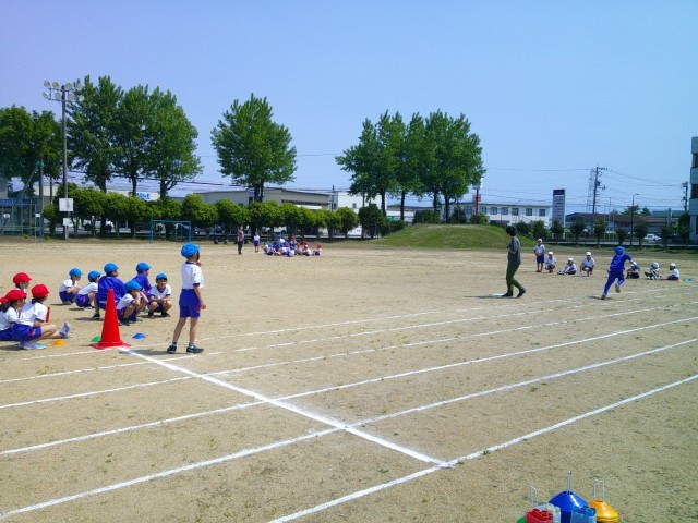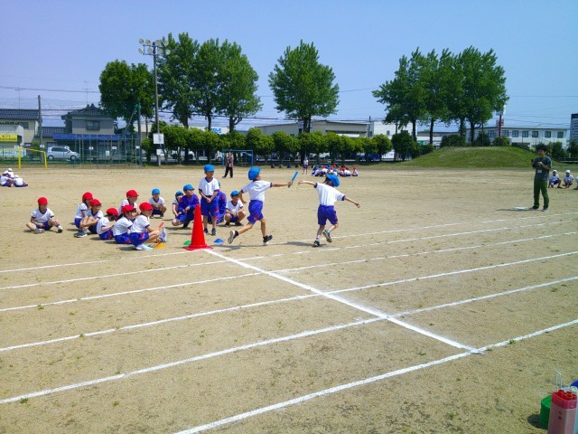 外でリレーの練習を始めました。スムーズなバトンパスになるように、「ゴー」と声をかけたり、手の高さを高くしたりして受け取りやすくなるように工夫していました。