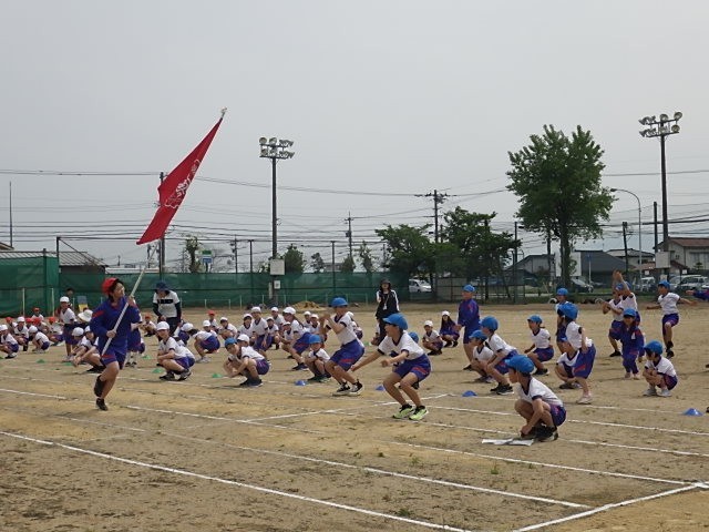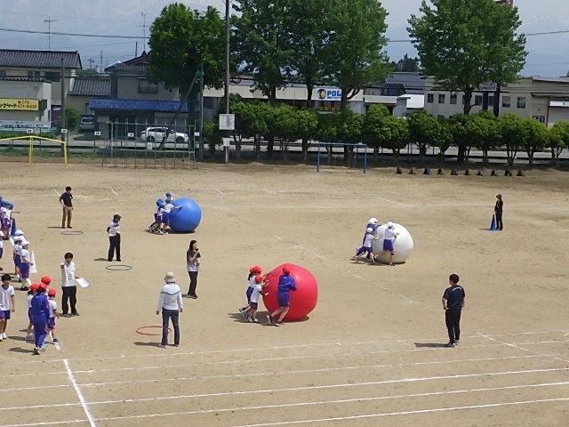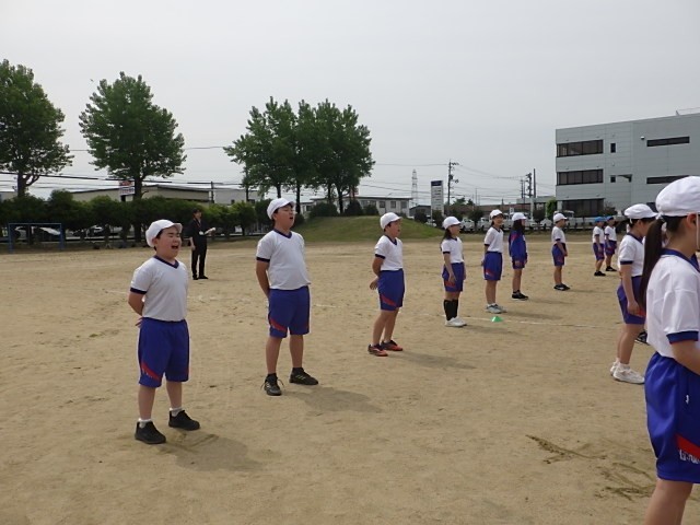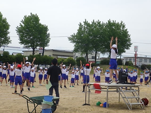 運動会に向けて全体練習を行いました。開閉会式の整列の仕方を確認したり、ラジオ体操や歌、応援の流れの練習をしたりしました。1回目の練習と思えないぐらい一生懸命がんばりました。なかよしタイムには、大玉転がしの練習も行いました。