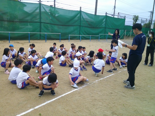 50m走の練習をしました。並び順を確認したり、スタートの姿勢を試したりしました。