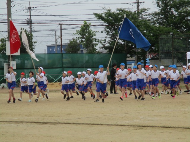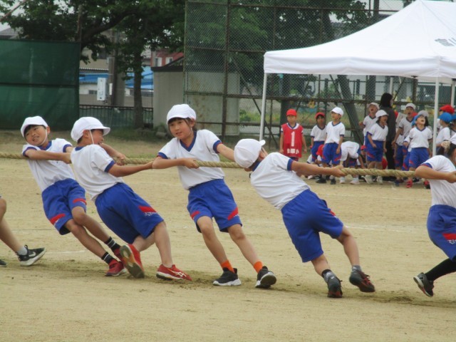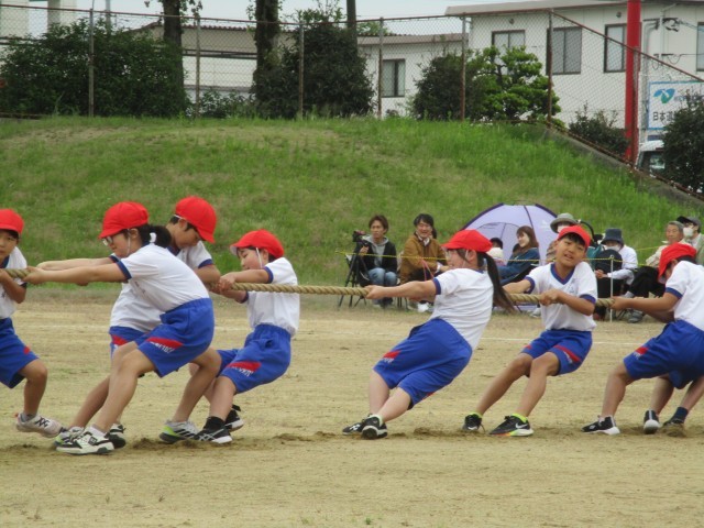 4,5,6年生による綱引きでは、体重をかけて綱を引き、各団一丸となって戦いました。