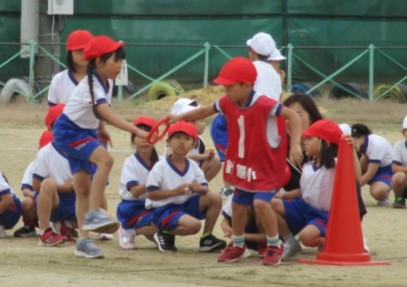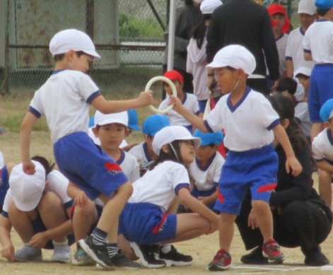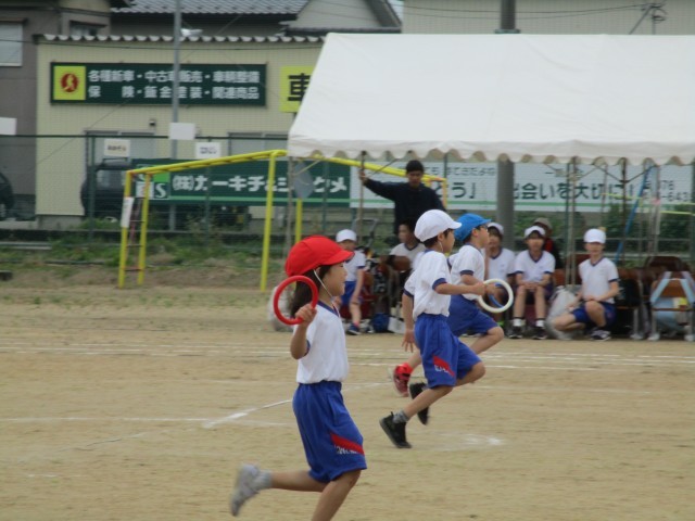 1,2年生による低学年リレーでは、リングバトンをつなぎながら全力で走りました。