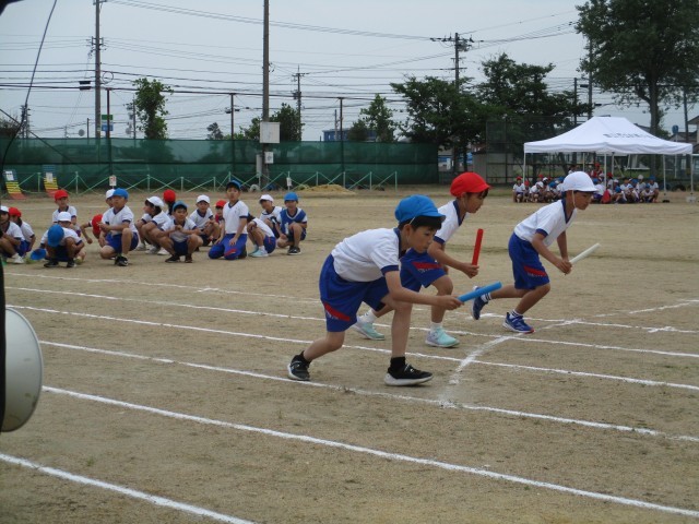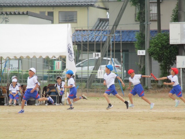 3,4年生による中学年リレーでは、スムーズにバトンパスを行い、スピードをおとさず走って競い合いました。
