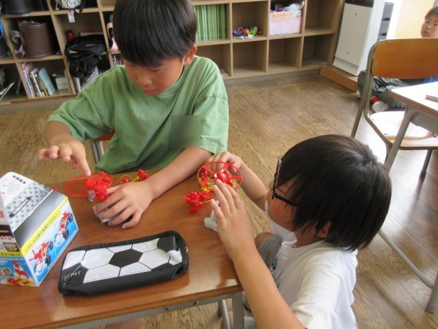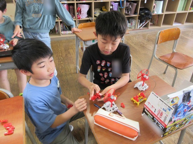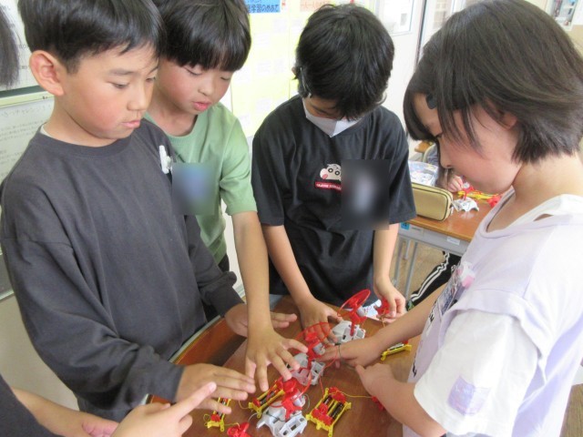 電流のはたらきについて学習しています。モーターを速く回すためには、どのように乾電池や導線をつなげばよいかを考えました。