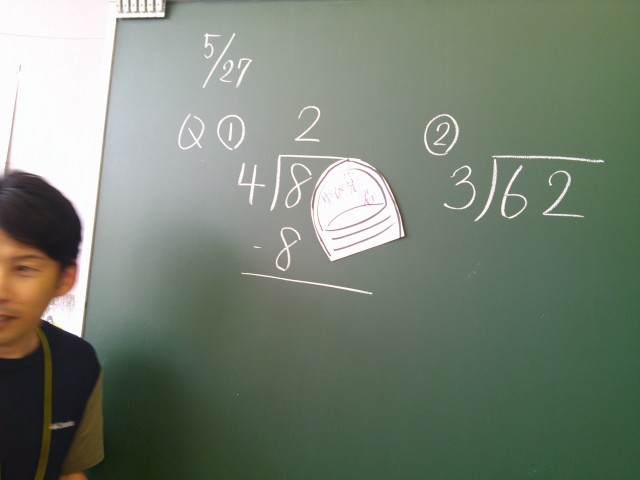 割り算の筆算の仕方について学んでいます。十の位から順に計算する方法を真剣に聞いています。