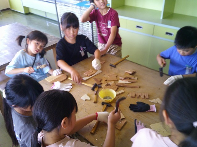 「くぎ打ちとんとん」というタイトルで、かなづちを使って釘を打ちました。道具の扱いを初めは怖がっている様子でしたが、次第に上達し、楽しそうに打っていました。