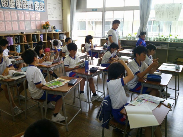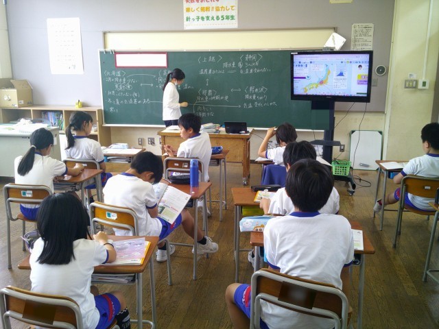 日本の気候区分について調べたことを発表しています。それぞれの地域の違いについて伝えながら、どうしてそのような違いが出るのか考えていました。
