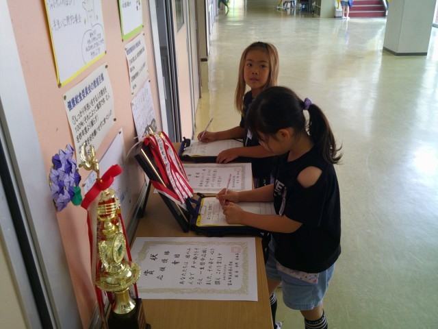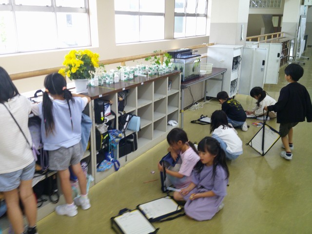 学校探検の続きをしています。運動会のトロフィーを見たり、5年生のメダカを観察したりしていました。