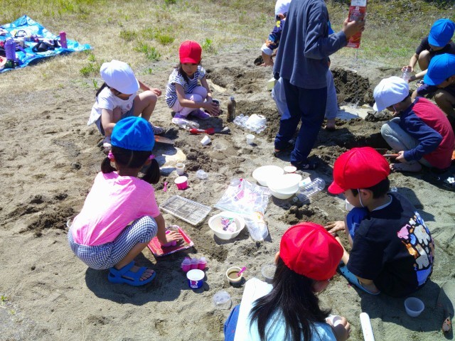 生活科では、砂で遊びました。水を使ったり、道具を使ったりしながら、思い思いの活動を進めていました。