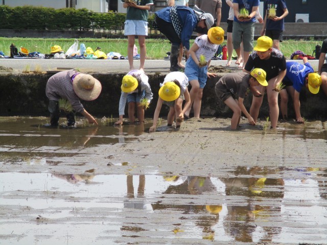 今日初めての田植え体験を行いました。延期になることが続きましたが、念願の田植え体験です。最初に足を入れる際は抵抗があったようですが、徐々に慣れて楽しく活動していました。田植えを終え、「こんなに大変だとは思わなかった、難しい」「でもみんなでやるのは楽しい」と話していました。とても貴重な体験となりました。