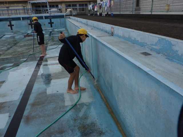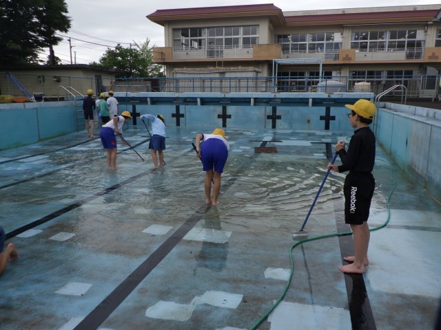 6年生でプール清掃をしました。床のよごれをデッキブラシで落としました。全員が一生懸命働きました。来週のプール開きが楽しみです。
