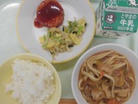 今日の給食の献立は、 ・ごはん ・すり身のお好みソースがけ ・湯葉和え ・味...